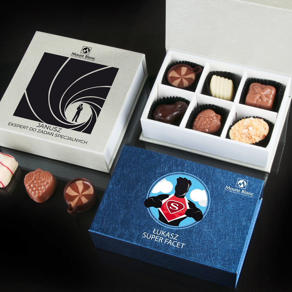 Nasze nowości wyróżniają się na tle dotychczasowych kolekcji. Są to wzory pełne humoru, które mają na celu wywołać słodki uśmiech na każdej twarzy. Na wysokiej jakości pudełeczkach nadrukowaliśmy zabawne wzory z możliwością personalizacji. Wśród nich zestawy dla najsłodszych facetów na świecie i tych, którzy są mistrzami ciętej riposty. Pojawiają się również wzory dla mężczyzn, którym czekolada dodaje energii "Powered by chocolate" oraz tych, którzy uważają się za ekspertów od zadań specjalnych. Jednak to nie wszystko! Podczas składania zamówienia, wystarczy, że podacie nam imię swojego chłopaka, a my umieścimy je na wieczku wybranej bombonierki.