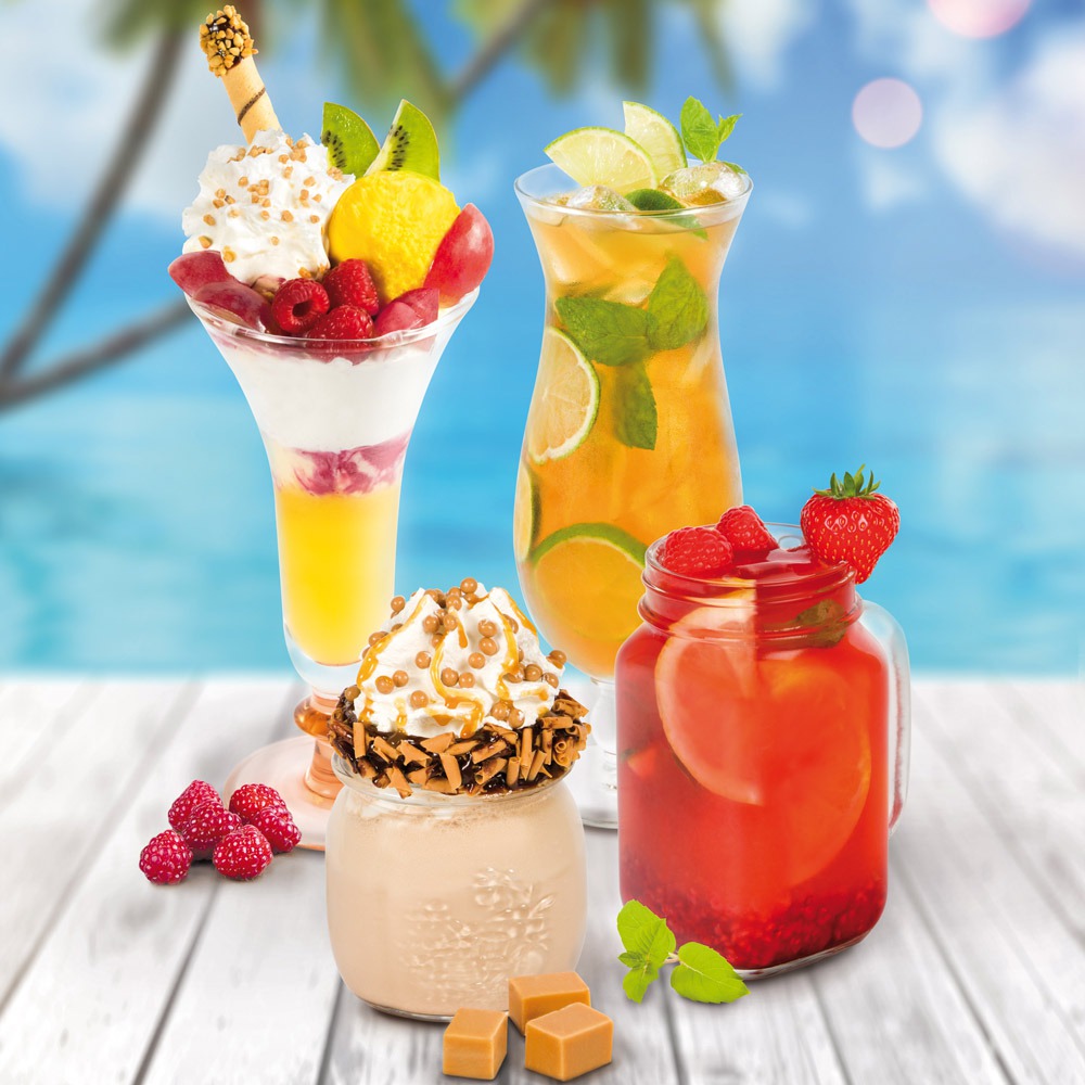 Letnie orzeźwienie, to również zimne napoje! Wśród nich wspaniale gaszące pragnienie Ice Tea pomarańczowe i mocno miętowe o smaku Mojito, owocowe lemoniady oraz przepyszne kawy mrożone urozmaicone o najróżniejsze dodatki.