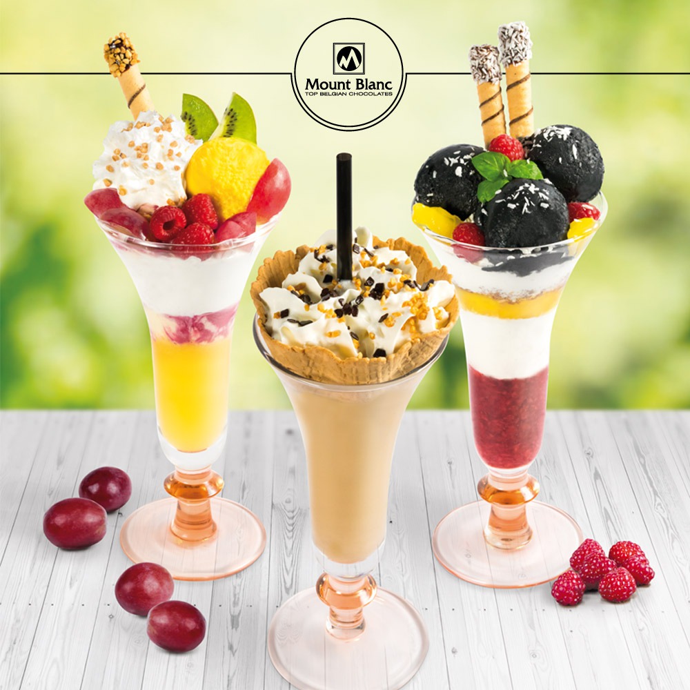 Desery lodowe Przed nami ciepłe, słoneczne dni, dlatego prezentacje naszych nowości rozpoczniemy od tego, na co Wszyscy czekali całą zimę-od deserów lodowych! Tym razem przygotowaliśmy dla Was dwie orzeźwiające propozycje. Pierwsza z nich to połączenie świeżo wyciśniętego soku pomarańczowego, lodów winogronowo-jogurtowych i lodów mango, bitej śmietany oraz świeżych owoców. Drugi puchar to zupełnie nowe doznanie smakowe. Specjalnie dla Was wprowadziliśmy do oferty lody czarny kokos. Nowość, która fascynuje kolorem i zachwyca smakiem. Te niepowtarzalne lody połączaliśmy z malinowym musem, konfiturą ananasową oraz bitą śmietaną. Musicie tego spróbować!